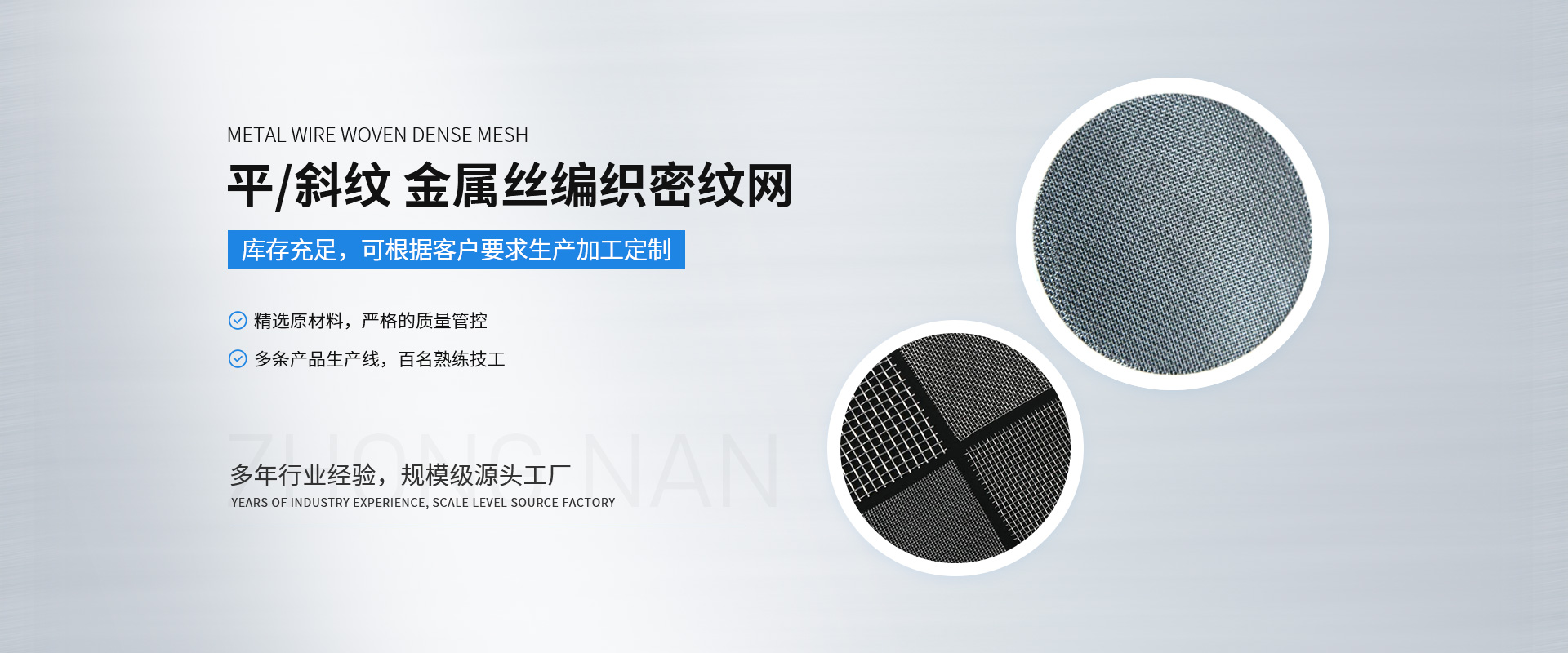 新鄉(xiāng)市中南金屬網(wǎng)有限公司成立于1999 年,公司設(shè)在河南省新鄉(xiāng)市。在過去的十幾年來,我們堅持以嚴(yán)格的管理措施、雄厚的技術(shù)力量、良好的工藝設(shè)施,質(zhì)量上乘、信譽(yù)為上為原則,把樹立良好的企業(yè)形象為工作宗旨,歷經(jīng)市場的嚴(yán)峻考驗并贏得廣大用戶的一致好評。金屬絲網(wǎng)編織結(jié)構(gòu)形式有平紋和斜紋兩種方法,嚴(yán)格按照航空軍品標(biāo)準(zhǔn)HB1862—93和標(biāo)準(zhǔn)GB/T5330—2003標(biāo)準(zhǔn),并等效采用國際標(biāo)準(zhǔn)ISO9044—90標(biāo)準(zhǔn)組織生產(chǎn)。 公司擁有生產(chǎn)設(shè)備和技術(shù)人員,主要生產(chǎn)不銹鋼篩網(wǎng)、磨料網(wǎng)、金屬絲編織方孔網(wǎng)、篩網(wǎng)、濾網(wǎng) 、篩分網(wǎng) 、過濾網(wǎng)、不銹鋼網(wǎng)、絲網(wǎng)、金屬絲網(wǎng)、金屬絲編織密紋網(wǎng)、特種網(wǎng)、不銹鋼密紋網(wǎng)、荷蘭網(wǎng)、席型網(wǎng)。絲網(wǎng)材質(zhì)選用黃銅、錫青銅、不銹鋼、純鎳等。席型網(wǎng)規(guī)格7/44目—500/3500目,方孔網(wǎng)規(guī)格1/2目—500目,網(wǎng)孔25mm—0.028mm,產(chǎn)品廣泛用于機(jī)械、化工、化纖、石油、醫(yī)藥、橡膠、濾芯、固體果粒篩分、流體過濾以及裝飾、防塵、骨架支撐等。 我們以“視質(zhì)量為生命、以信譽(yù)求生存、以科技促發(fā)展、以優(yōu)*產(chǎn)品為客戶服務(wù)”的經(jīng)營理念,真誠的希望與各界人士攜手并進(jìn),共創(chuàng)輝煌!